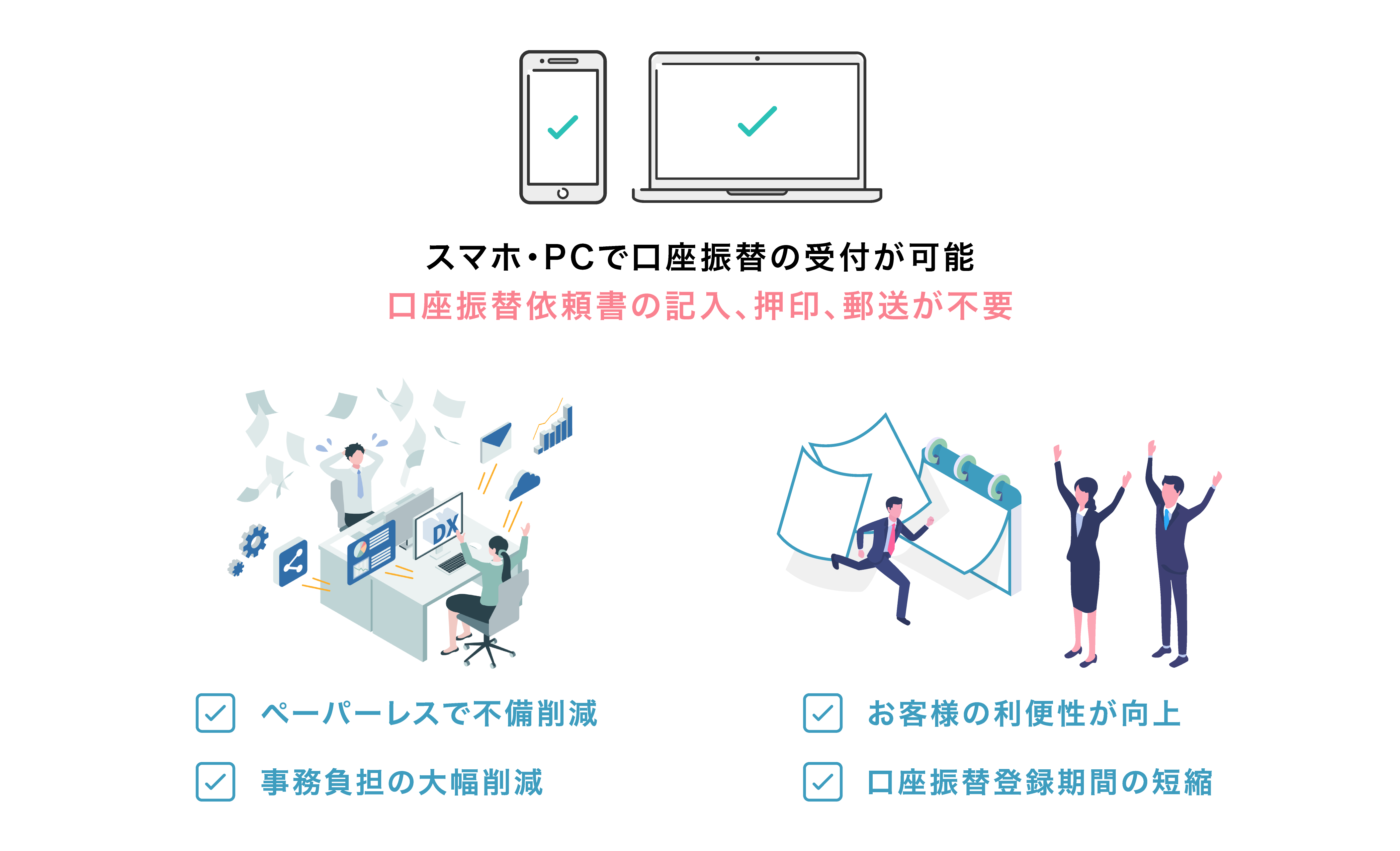 集金・回収業務に費やしていた時間や費用、マンパワーなどの大幅な削減が期待できます。貴社のお客様にとっては、銀行振込のために金融機関やATMに出向く手間、現金を準備する時間・リスクを軽減できます。